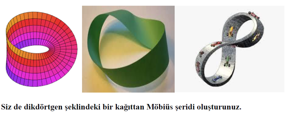 Möbius şeridi, August Ferdinand Möbius tarafından tanımlanmış olup uzunca bir şeridin bir ucunu 180 derece bükerek diğer ucu ile birleştirilmesiyle elde edilen yüzeydir. Möbius şeridinin üzerindeki bir noktadan hareket etmeye başlandığında bütün alan taranarak aynı noktaya geri dönülür çünkü normal bir şeridin aksine möbius şeridinin yalnızca bir yüzü vardır (Demir, Sezer ve Özdemir, 2018). Möbiüs Şeridi, M.C. Escher gibi bazı sanatçılara ilham kaynağı olmuştur. Escher, bir eserinde bir karınca ailesinin şeridin tek ve hiç bitmeyen yüzeyinden geçtiğini resmetmiştir. Yine Kazakistan’da bulunan millî kütüphane, Möbius şeridi şeklinde tasarlayarak uluslararası yarışmada birincilik kazanmıştır. Möbius şeridi, havalimanlarında bavulları taşıyan bantlar gibi bir çok alanda kullanılmaktadır. Böylece bantların tüm yüzeyi eşit miktarda aşınır ve daha uzun süre dayanması sağlanır. Möbius şeritleri ayrıca kaset kayıtlarında da kullanılır (https://bilimgenc.tubitak.gov.tr/algimizi-zorlayan-nesne-mobius-seridi adresinden alınmıştır).
